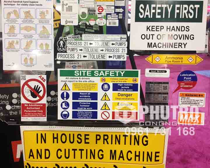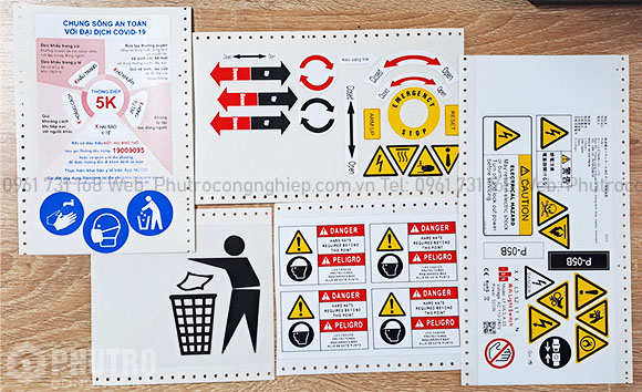 In nhãn mác cảnh báo - nhãn mác sản phẩm theo yêu cầu bằng máy In, cắt, bế nhãn tự động CPM-100HG5 hãng MAX JAPAN