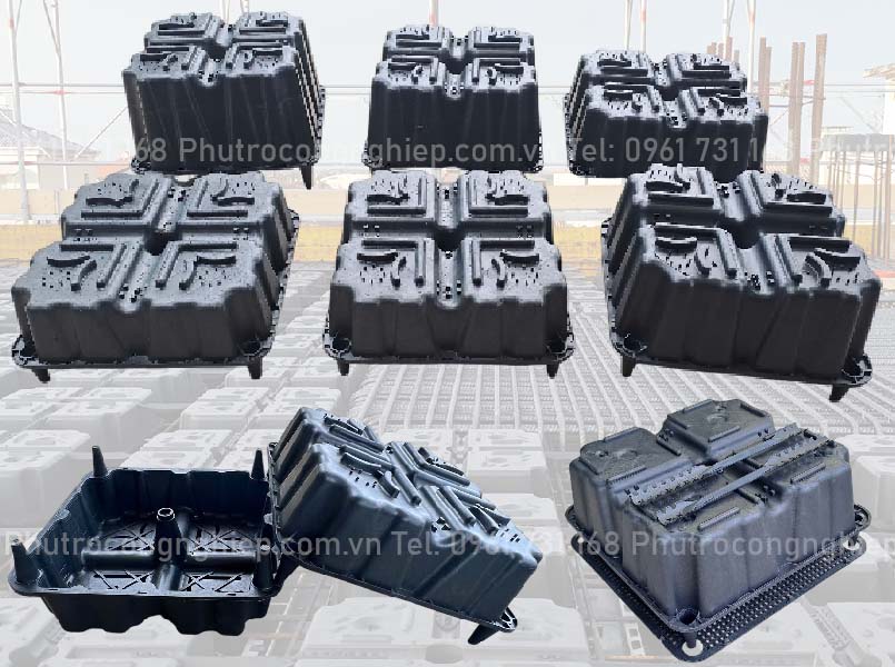 - Phần thân hộp (phần chính): Dạng hộp rỗng có hình vuông, được làm từ nhựa PP tái chế: bền nhẹ, chống ăn mòn. Bề mặt có hộp Uboot có gân cứng tăng khả năng chịu lực và chống biến dạng. Có lỗ thông khí, khe chống nổi khi đổ bê tông.