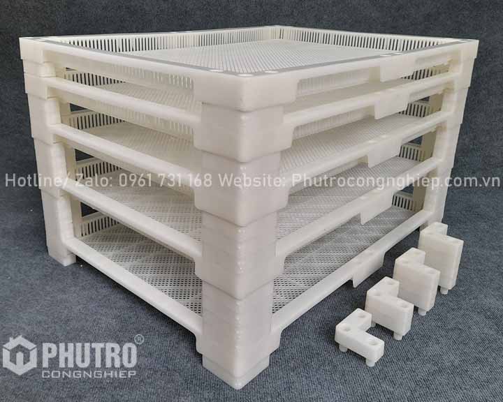 Với thiết kế nhẹ, dễ dàng di chuyển và có thể xếp chồng lên nhau tiết kiệm diện tích mà không lo bị cong vênh hay biến dạng bởi tác động mạnh. Ưu điểm dễ làm sạch lỗ thoát nước, khí trên bề mặt để dễ làm khô hiệu quả cao trong quá trình sấy sản phẩm.