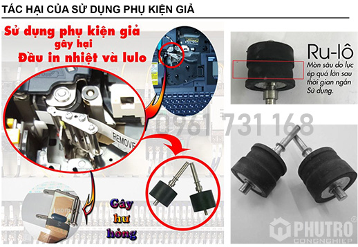 ► Tác hại của việc sử dụng phụ kiện (ống lồng, mực in, nhãn tape) kém chất lượng không thương hiệu (hàng giả - hàng nhái) sẽ dẫn đến giảm tuổi thọ máy in ví dụ như: hỏng đầu in, nhanh mòn quả rulo cao su,...