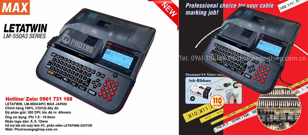 Máy in ống lồng đầu cốt MAX LM-550A3/PC C72 chính hãng MAX - Nhật Bản là thiết bị chuyên dụng, phổ biến, gần gũi với người sử dụng trên thị trường. Ứng dụng của máy: đánh dấu dây điện trong tủ bảng điện; Hệ thống điện trong các nhà máy, xí nghiệp; Hệ thống điện dân dụng và tòa nhà cao tầng; Các dự án điện lực, viễn thông, năng lượng mặt trời,...