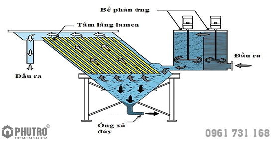 Nước phân phối vào bể lắng theo chiều từ dưới lên, khi đi qua các khối tấm lắng lamen thì các cặn bẩn lơ lửng bị lắng lại trong bề mặt ống của tấm lắng trượt xuống theo chiều ngược lại và được đọng lại ở phần tập trung và chứa cặn. Ống lắng có dạng nghiêng hai chiều ngược nhau làm tăng hiệu quả lắng cặn, do dòng nước đi từ dưới lên hòa trộn vào nhau thành các dòng soát cục bộ làm giảm sự lắng đọng cặn và rong rêu bám trên bề mặt tấm lắng.
